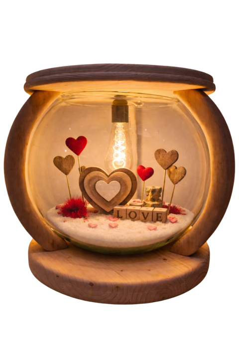 Cette lampe bois décorée amour transforme votre intérieur en cocon romantique. Dans son globe en verre, un décor de cœurs et d’éléments naturels est mis en valeur par une lumière douce et chaleureuse.